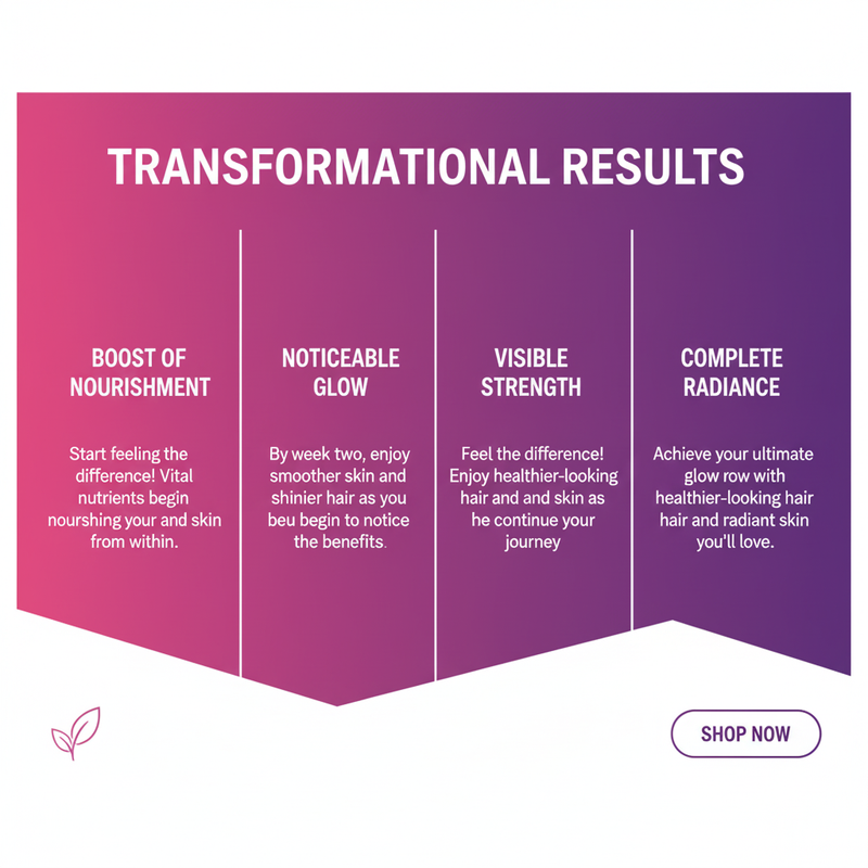 Experience a journey of renewal and revitalization. Our Hair Growth Gummies aren't just a quick fix; they're a commitment to your hair and skin's long-term health and beauty. Witness the powerful, cumulative effects as vital nutrients work from within, unveiling a noticeable glow, undeniable strength, and ultimately, complete radiance you'll love.
